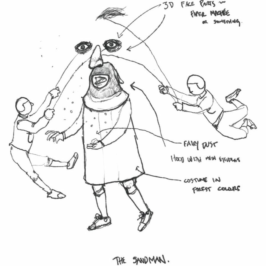 PB: "The Sandman. This puppet first presented its possibility in an outdoor sculpture garden that the Old Trouts created at Camp Chief Hector in the Bow Valley Corridor — where the Old Trouts all met back in 1991 working as camp counsellors. Originally it was components of the face — ears, nose, eyes — that were affixed to trees and you had to line yourself up in the forest in just the right way to see the face: the face of the Sandman upon the land."